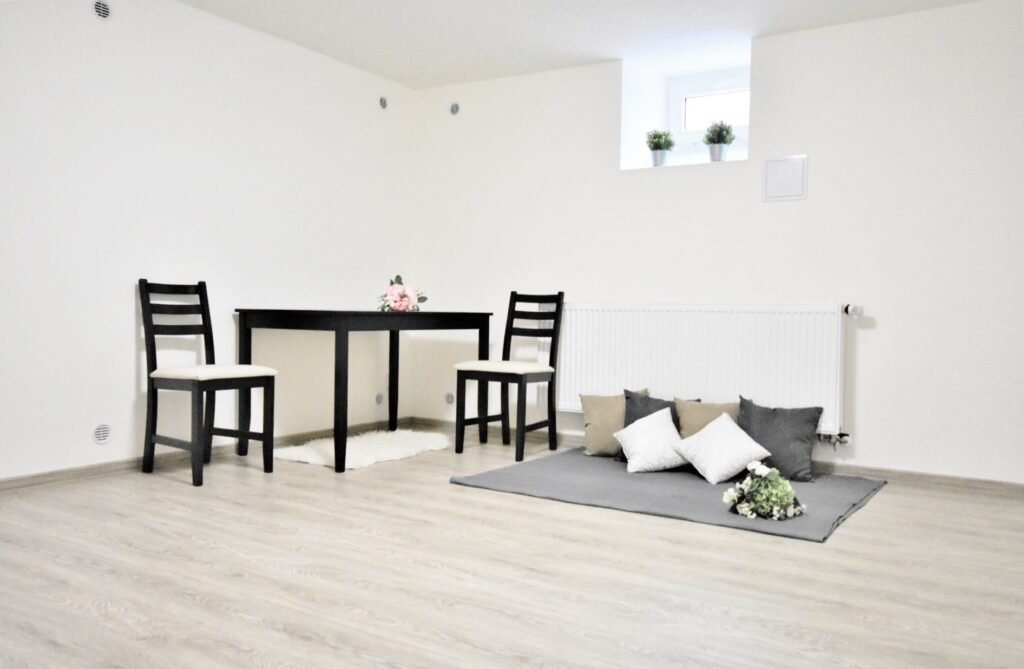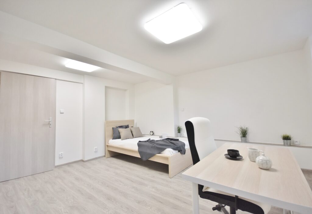 Jeden z nich je zařízený ve studentském duchu, a proto ho ocení především mladí vysokoškoláci, kteří hledají soukromí a klid pro bydlení i studium. Byt má rozlohu 39 m², je situovaný v 1. PP a je kompletně zrekonstruovaný. V kuchyni je nová kuchyňská linka s ledničkou. Prostorná moderní koupelna nabízí sprchový kout, umyvadlo, WC a místo na pračku. Pokoj bude vybavený pro 2 studenty postelemi, skříněmi a psacími stoly.