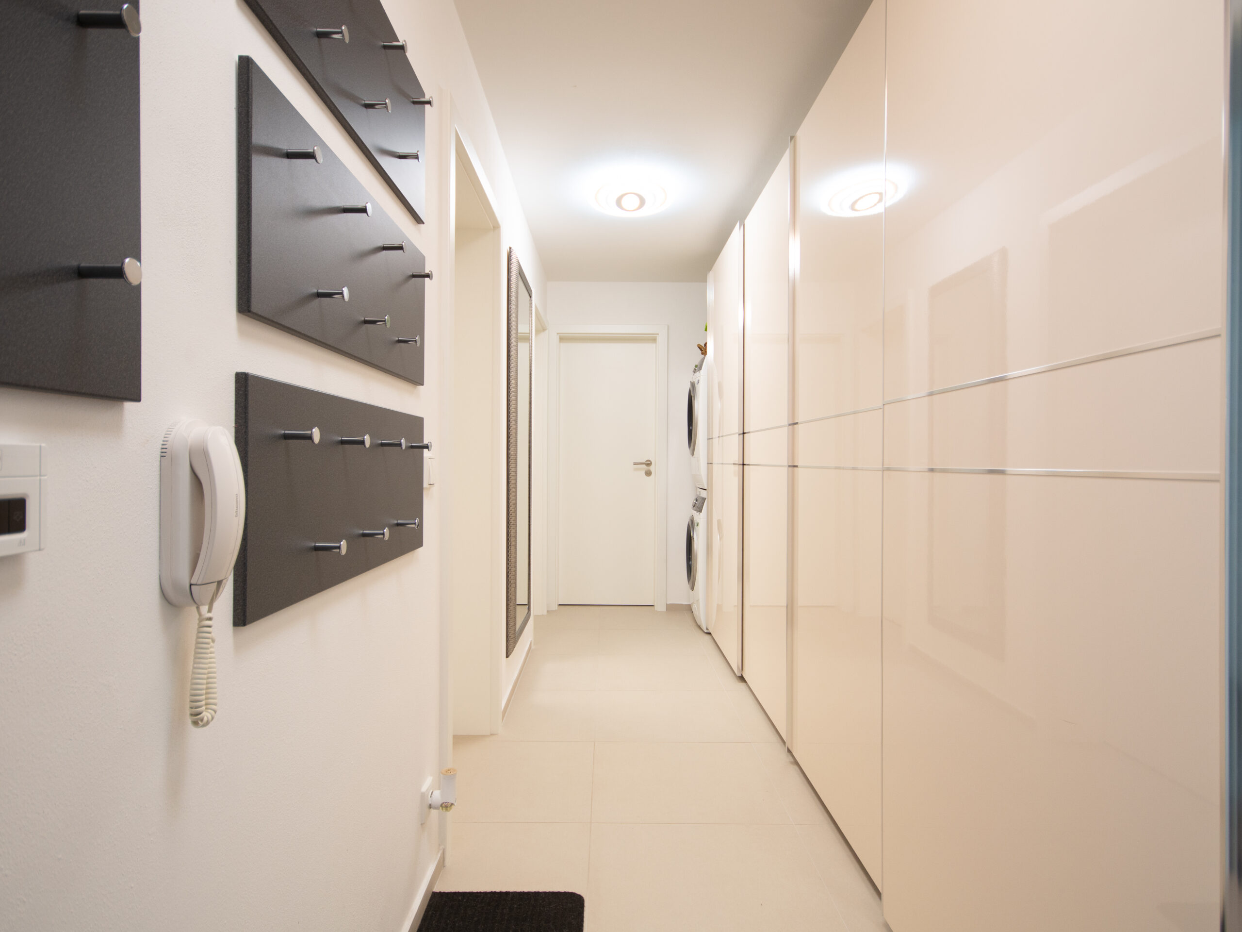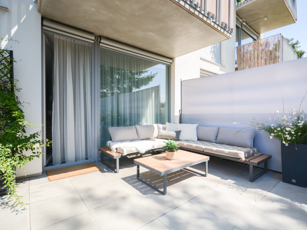 Při vstupu do bytu vás přivítá prostorná předsíň, která nabízí dostatek místa pro pračku, sušičku a úložné prostory. Byt má koupelnu se sprchovým koutem a WC a další samostatnou toaletu. Předsíň dále vede do luxusní kuchyně vyrobené na míru, která je propojená s obývacím pokojem, odkud se dostanete na zahradu. K dispozici jsou také dva samostatné pokoje, přičemž oba mají rovněž přímý vstup na zahradu.