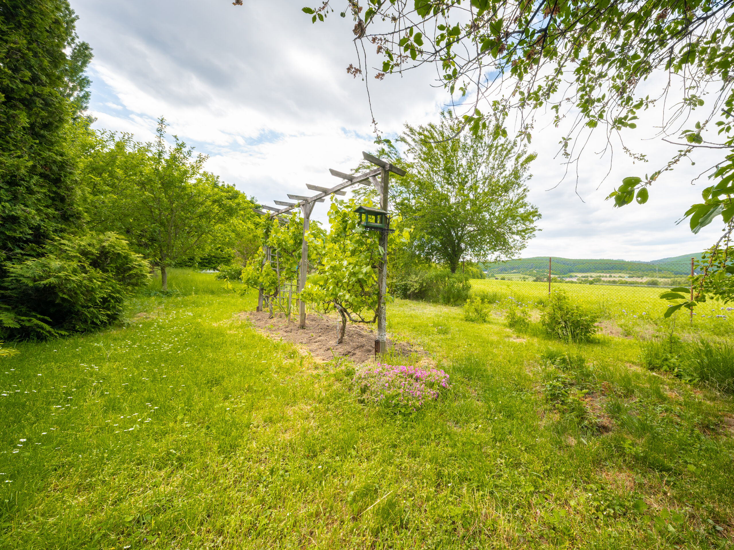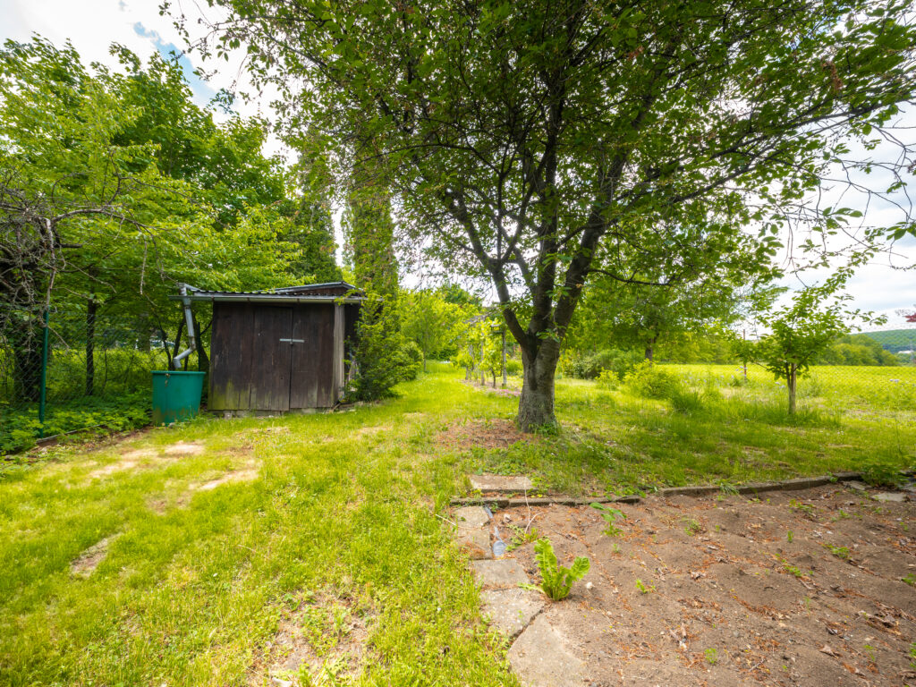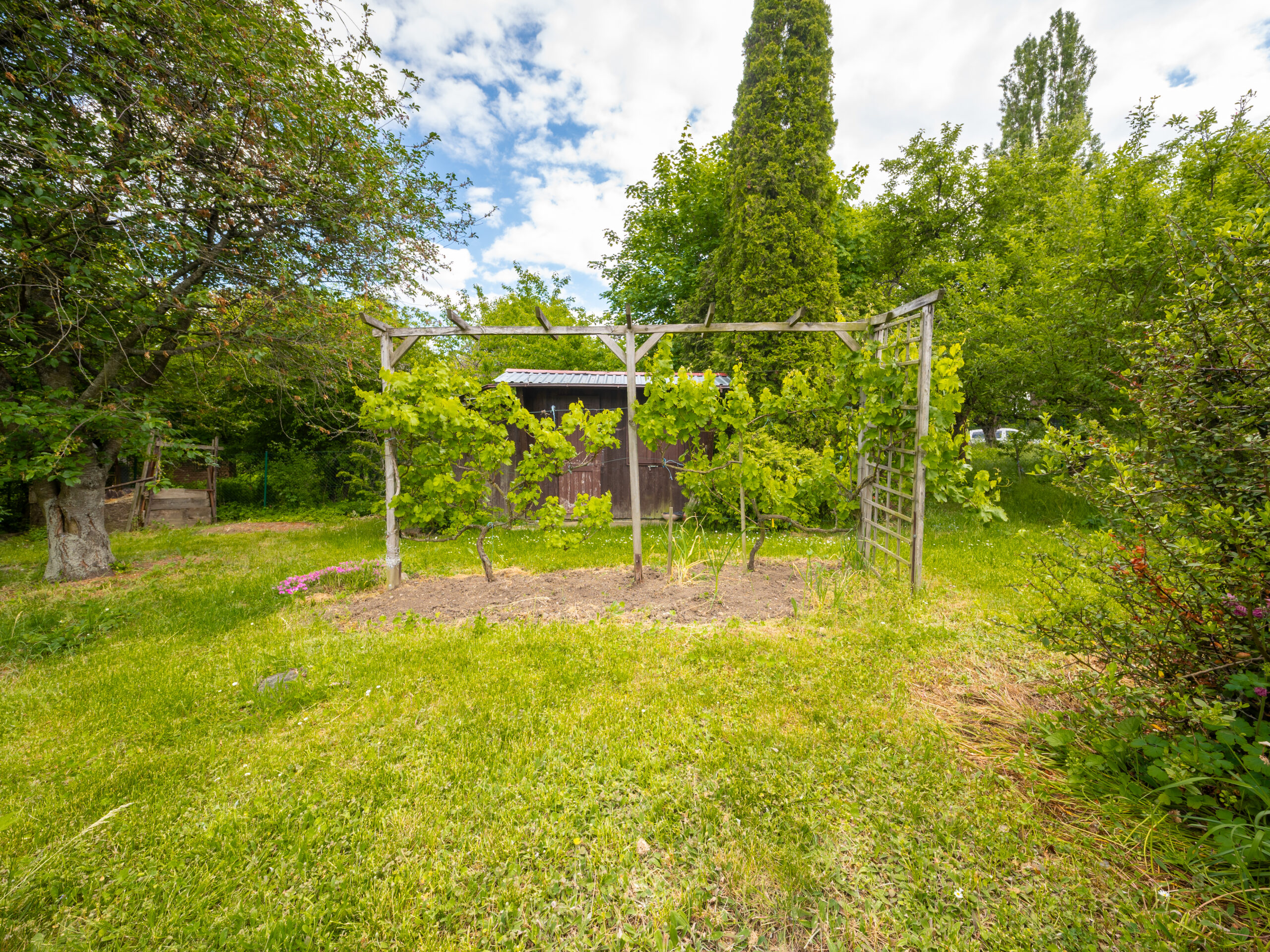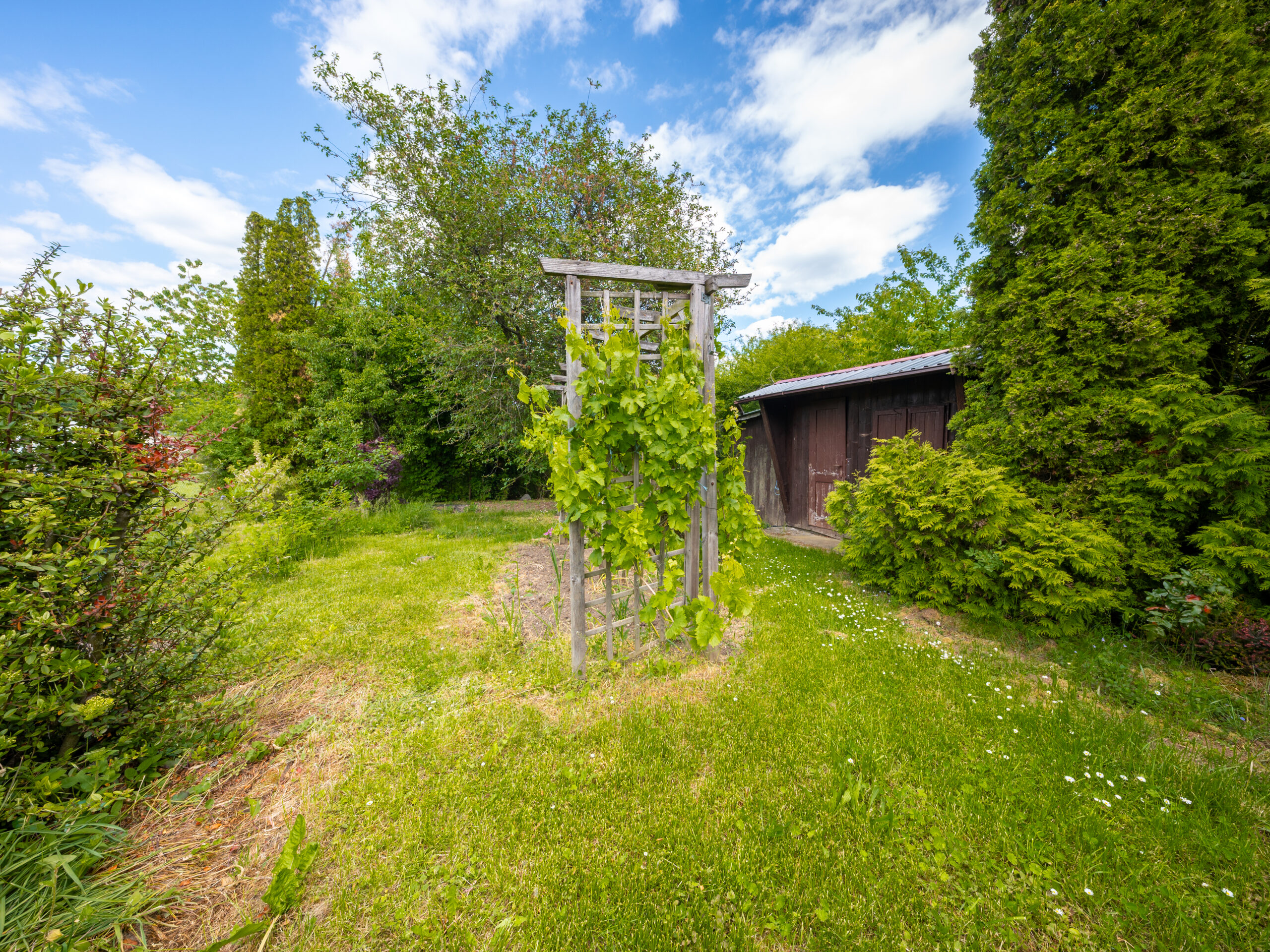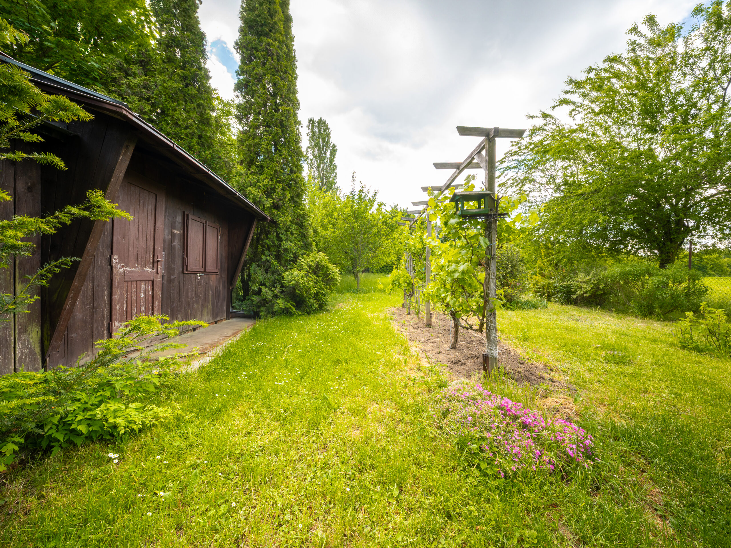 Součástí zahrady je také zahradní domek vybavený vším potřebným nářadím – najdete tu například ruční sekačku a další pomůcky pro údržbu zeleně a plodin.