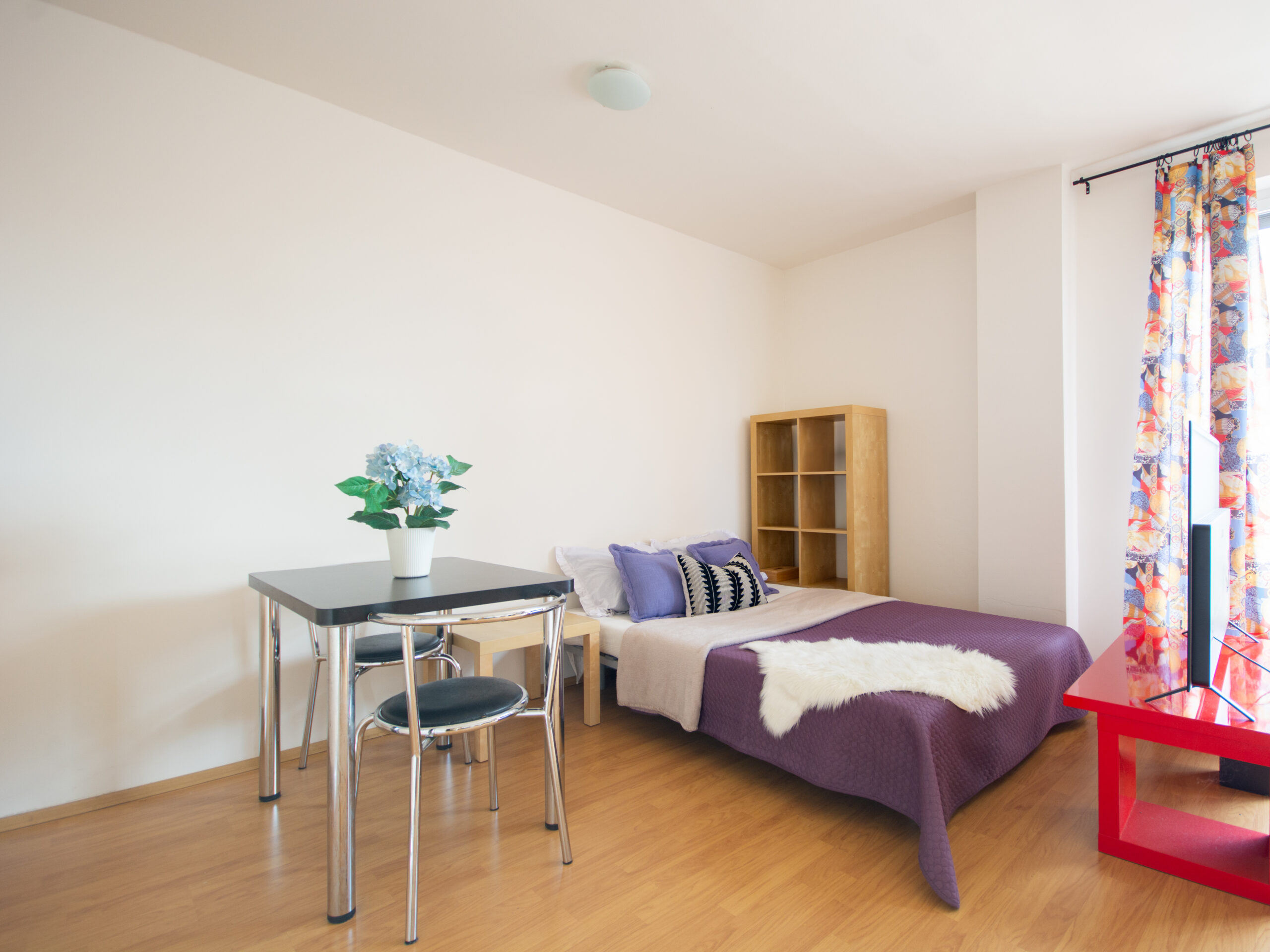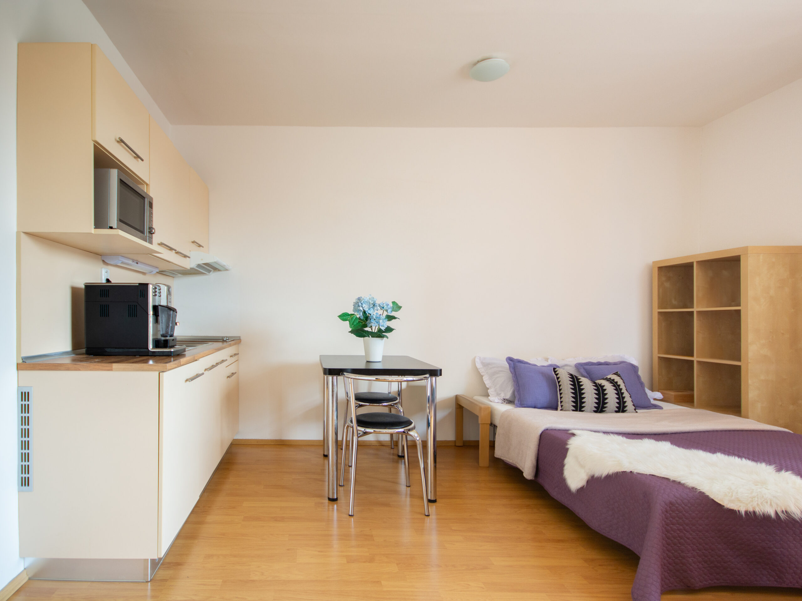 Byt se nabízí včetně vybavení, které je již zahrnuto v ceně (vestavěné skříně, kuchyňská linka včetně spotřebičů, jídelní stůl a židle, pracovní stůl, postel, knihovna).