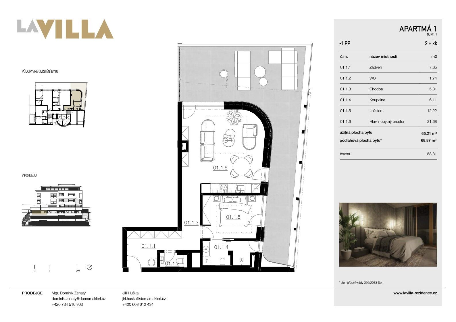 Tento byt 2+kk je ideální jako víkendové či letní apartmá nejen pro vás, ale také na investici. Nabízí ty nejkvalitnější materiály. Interiér si můžete zařídit podle svých představ. Design interiéru tvoří renomovaní architekti ze Semela Ateliers, kteří dali tvář i samotné rezidenci.