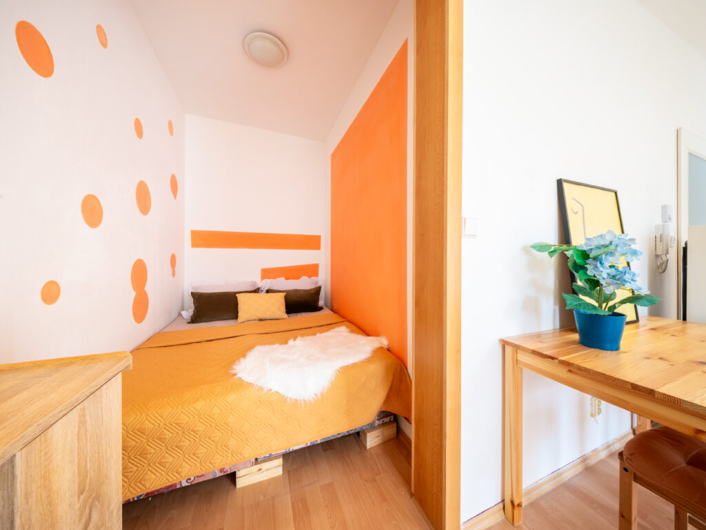 nikou, v níž je umístěna postel, a tím oddělena od ostatního prostoru. V koupelně najdete