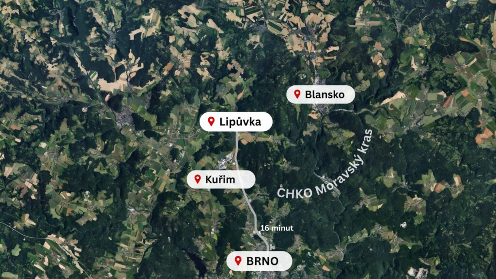Větší nákupy pořídíte v supermarketech Penny, Lidl a Kaufland v Kuřimi, která je vzdálená jen 9 minut autem. S dětmi můžete vyrazit na výlet na naučnou stezku Babí lom, do přírodního areálu Zlobice nebo navštívit kuřimský akvapark. Do Brna se pak autem dostanete za 15 minut.